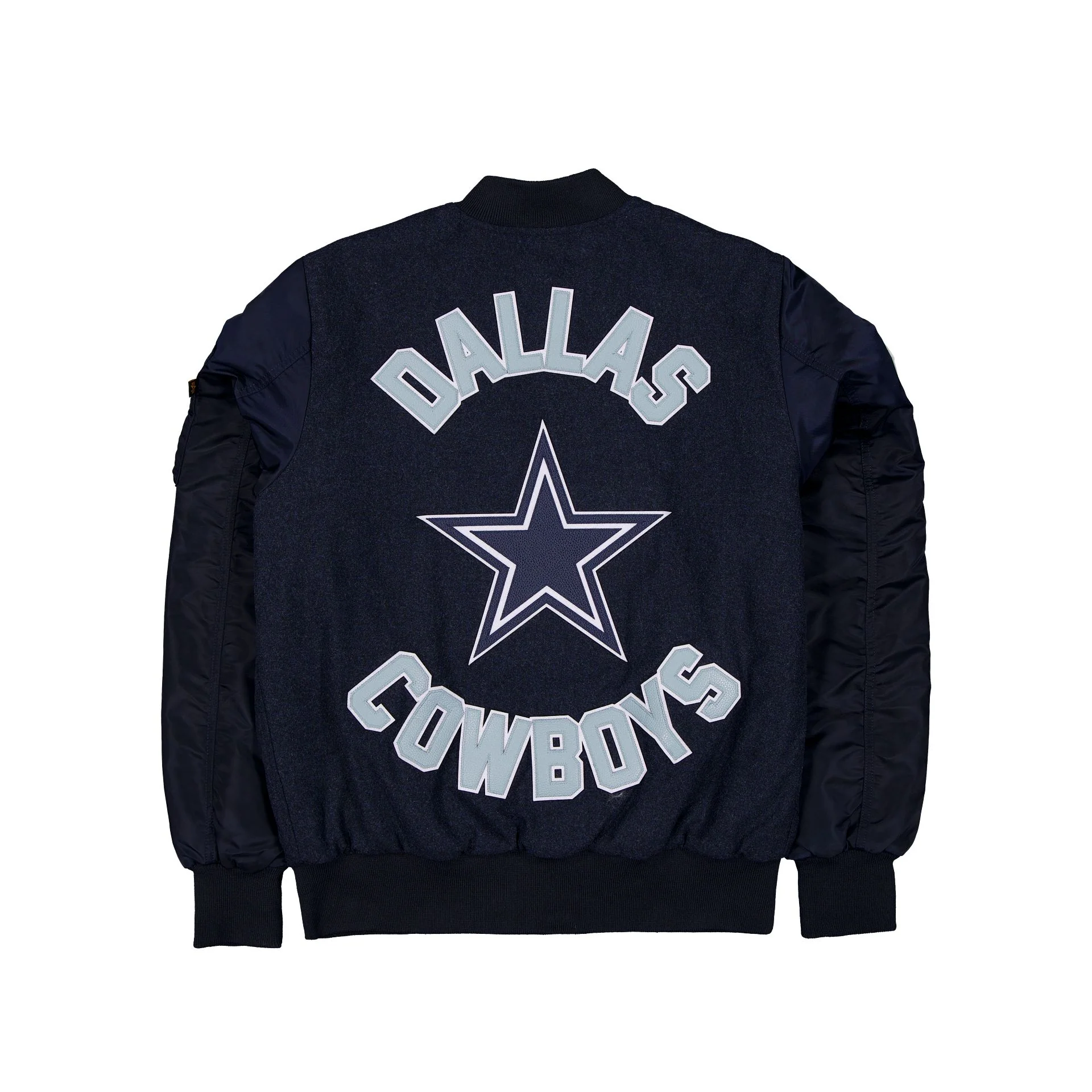 The Alpha Industries x Dallas Cowboys MA-1 Wool Varsity Jacket features a faux leather applique Cowboys logo at the left chest with a matching team logo and wordmark at the rear. Additional details include a utility pocket with the Alpha Industries ribbon at the left sleeve and an embroidered Cowboys patch at the right sleeve.
