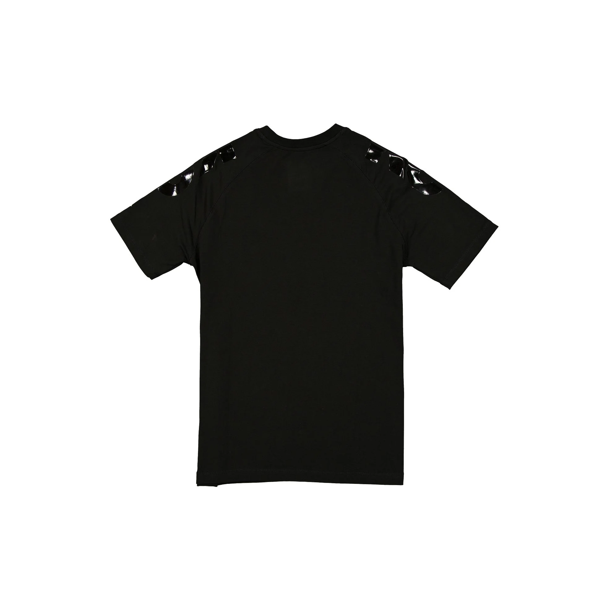 The Kansas City Chiefs 2025 Functional Fandom Black Short Sleeve T-Shirt features an embroidered silicone Chiefs logo at the left chest with an Official NFL Combine Authentic patch at the left hip. Additional details include a clear gel ink team wordmark at the shoulders. The shirt has moisture-wicking and antimicrobial fabric with UV protection.