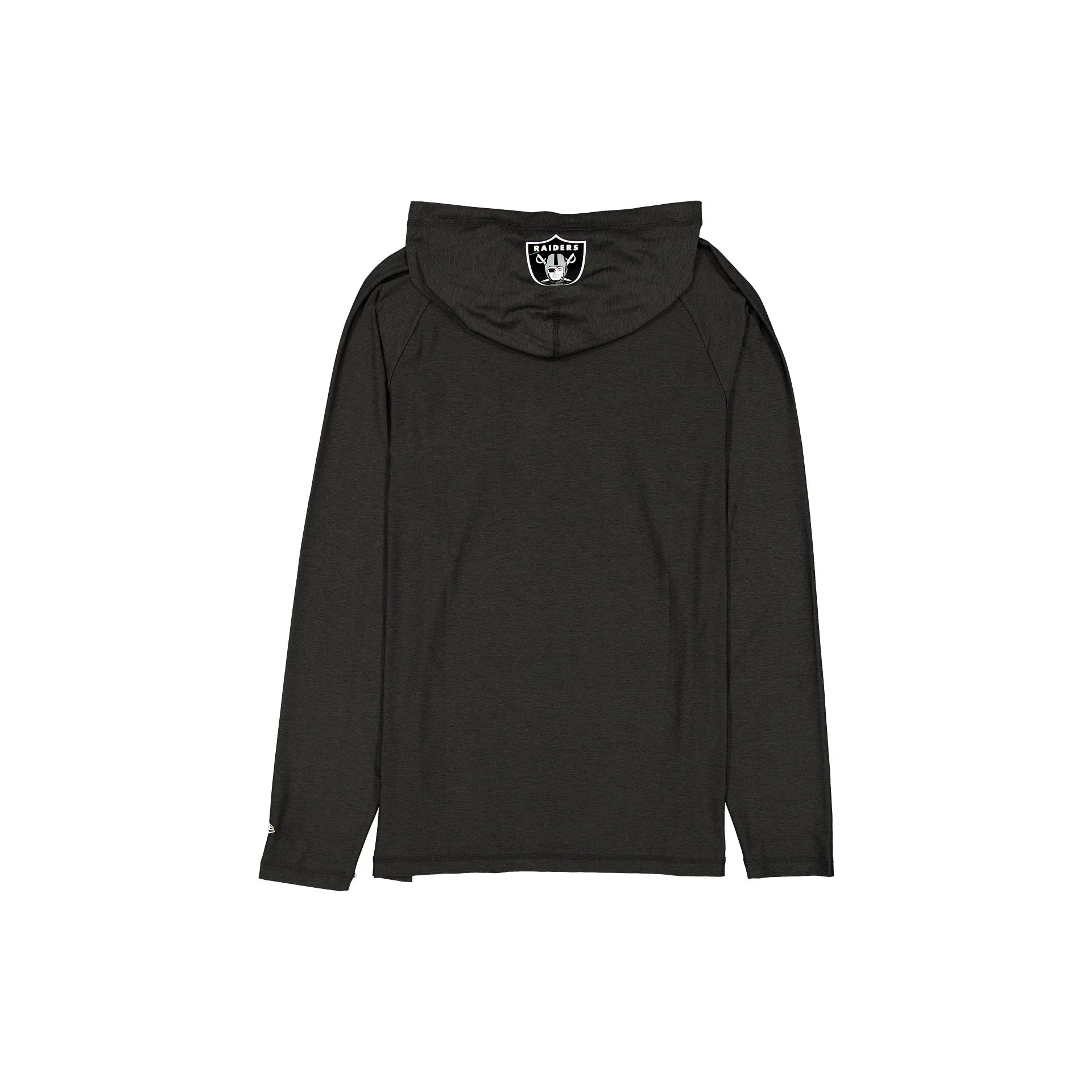 The Las Vegas Raiders 2025 Functional Fandom Hoodie features a silicone print Raiders logo at the chest with a matching logo at the hood and an Official NFL Combine Authentic patch at the left hip. Additional details include moisture-wicking and antimicrobial fabric with UV protection.