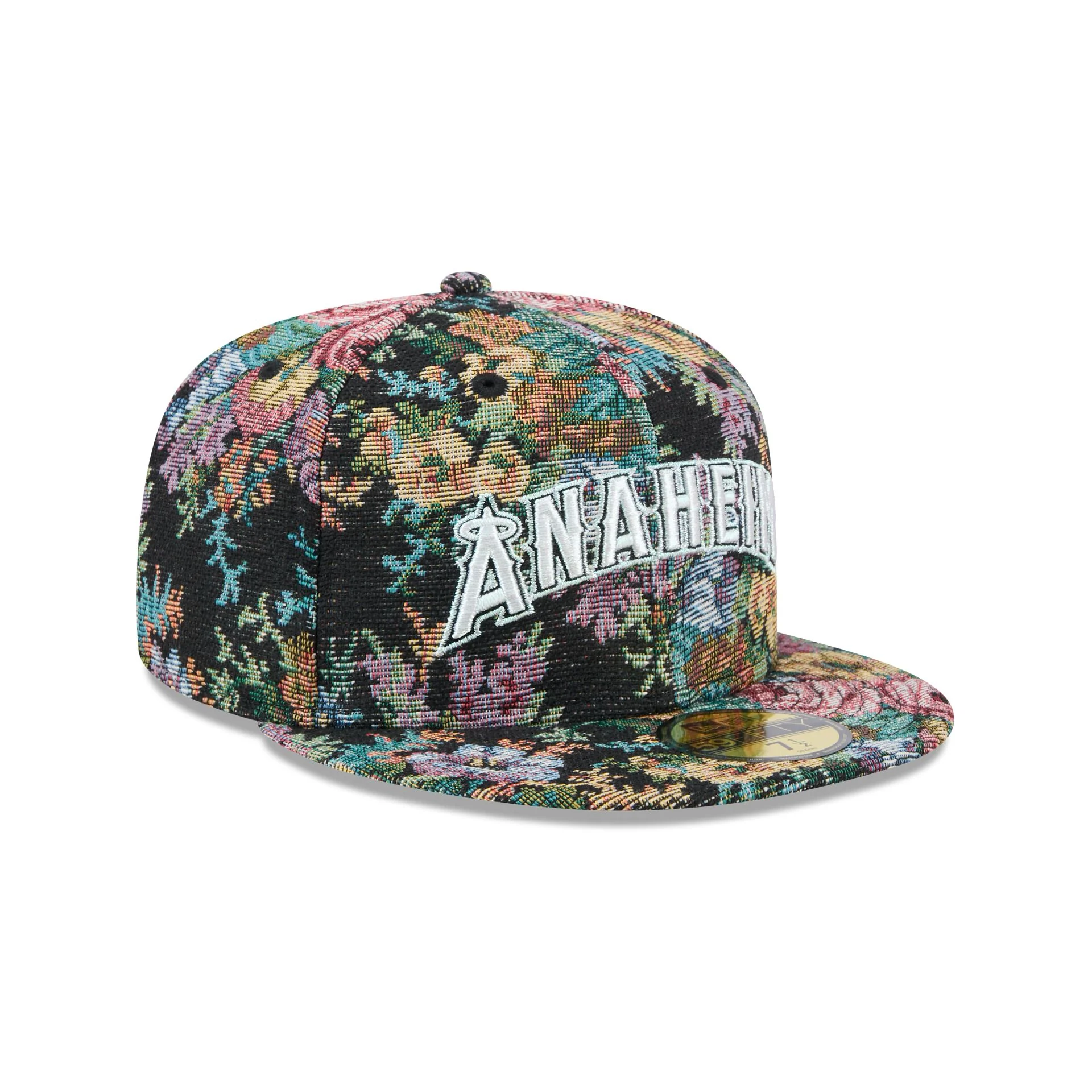 The Los Angeles Angels Jacquard Pattern 59FIFTY Fitted Cap features an embroidered Angels Cooperstown wordmark at the front panels with a matching MLB Batterman logo at the rear. Additional details include a floral jacquard pattern throughout and a gray undervisor.