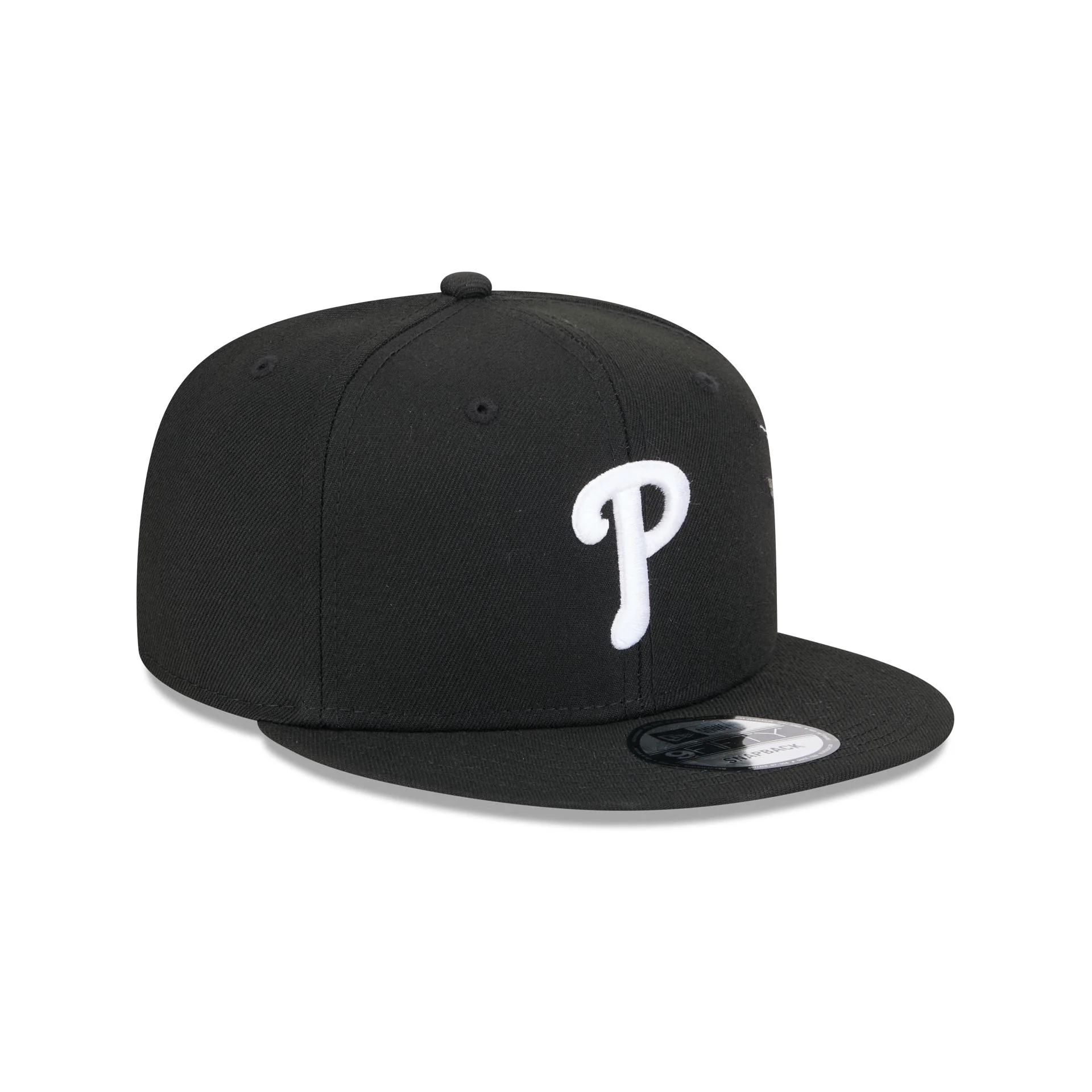 The Philadelphia Phillies City Art 9FIFTY Snapback features an embroidered Phillies black and white logo at the front panels and an embroidered city banner with art at the right-wear side. Additional details include a snapback closure at the rear and a gray undervisor.