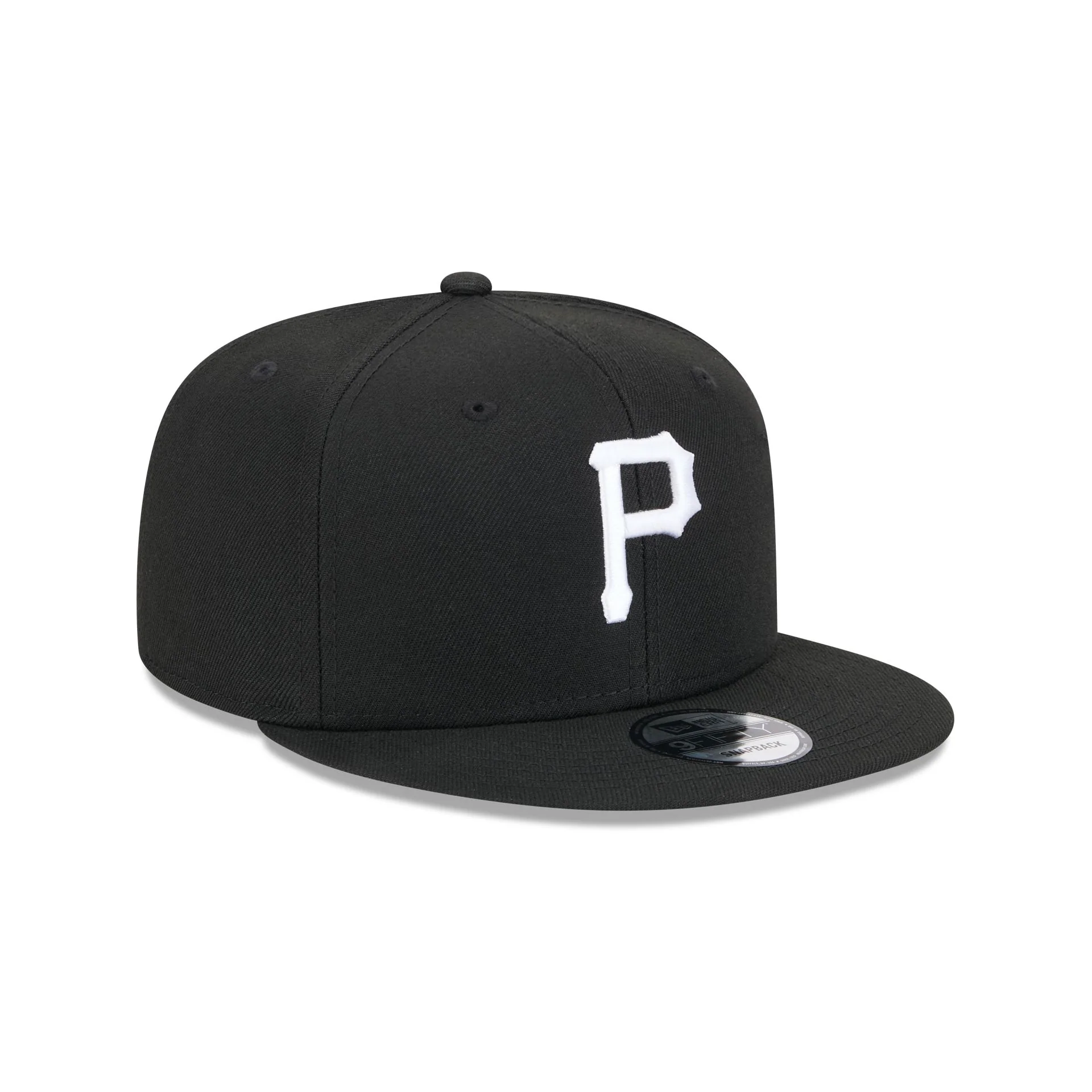 The Pittsburgh Pirates City Art 9FIFTY Snapback features an embroidered Pirates black and white logo at the front panels and an embroidered city banner with art at the right-wear side. Additional details include a snapback closure at the rear and a gray undervisor.
