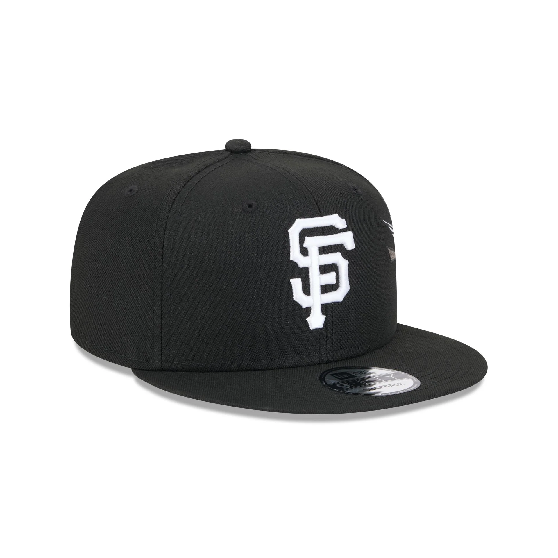 The San Francisco Giants City Art 9FIFTY Snapback features an embroidered Giants black and white logo at the front panels and an embroidered city banner with art at the right-wear side. Additional details include a snapback closure at the rear and a gray undervisor.