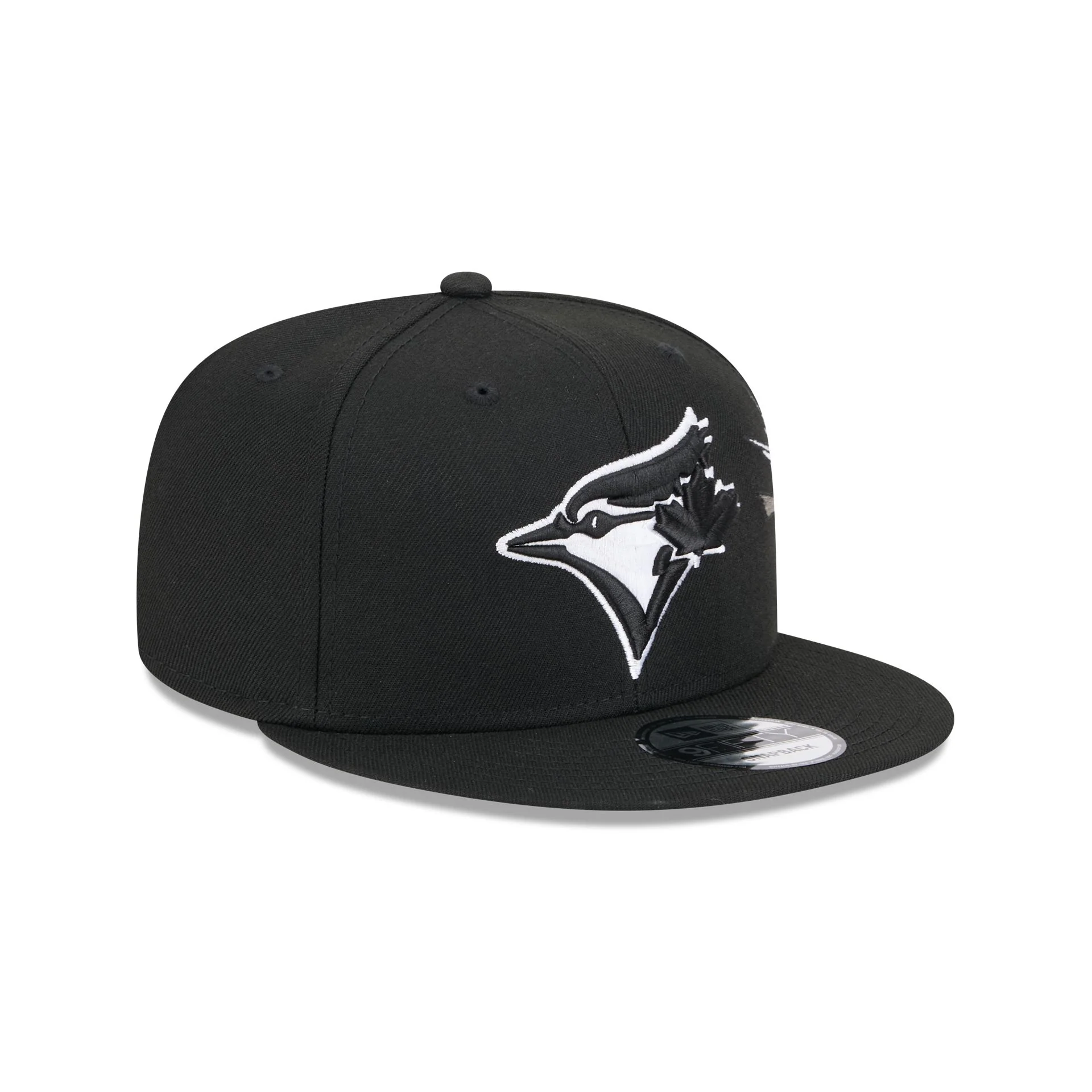 The Toronto Blue Jays City Art 9FIFTY Snapback features an embroidered Blue Jays black and white logo at the front panels and an embroidered city banner with art at the right-wear side. Additional details include a snapback closure at the rear and a gray undervisor.