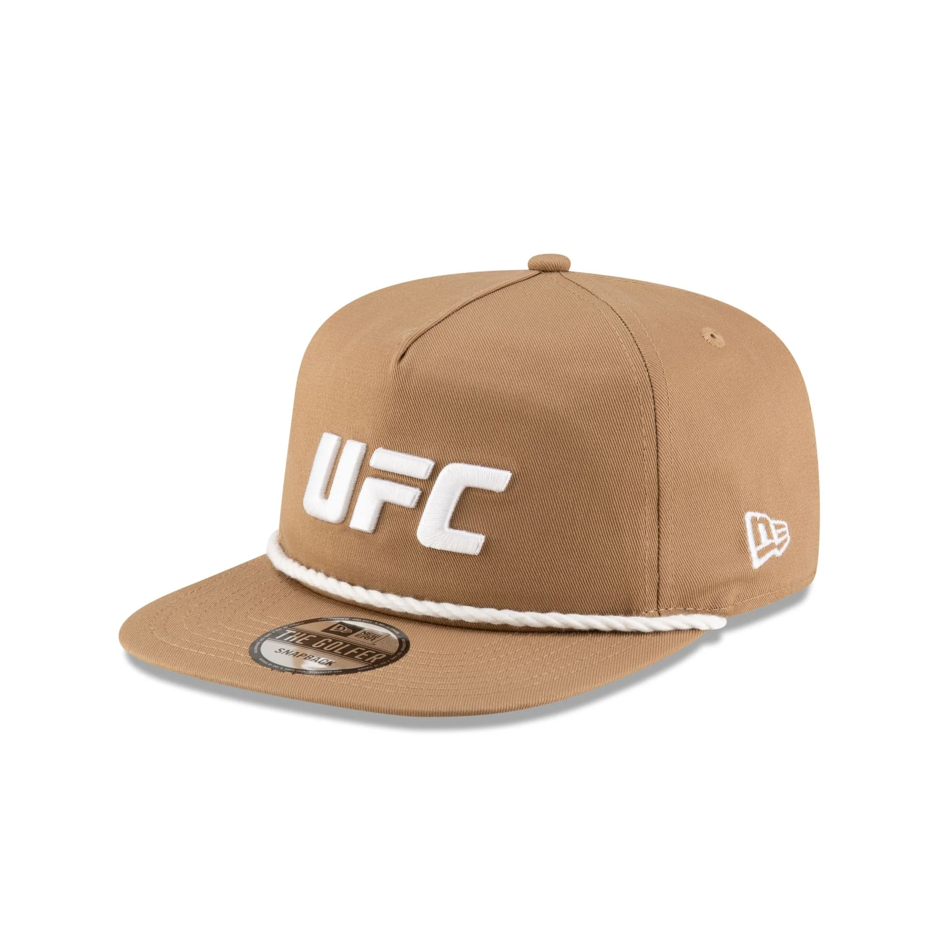The UFC Mexico Khaki Golfer Hat features an embroidered UFC logo at the front panels with a Mexican flag patch at the right-wear side. Additional details include a rope at the base of the crown and a snapback closure at the rear.